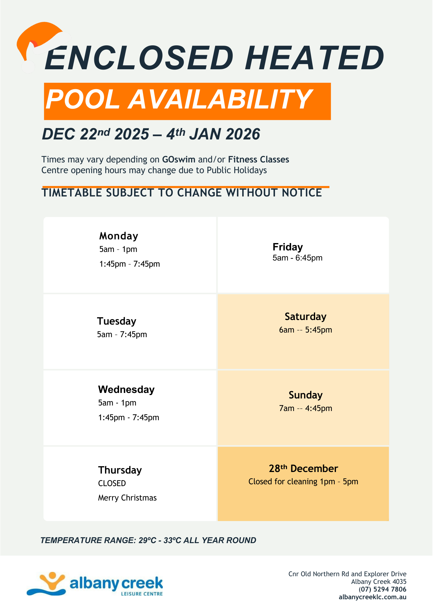 HomeTimetablesChrismas Timetables Christmas group exercise Timetable Christmas functional training Timetable Christmas Aqua Aerobics Timetable Christmas Enclosed heated pool Timetable Christmas reformer pilates Timetable
